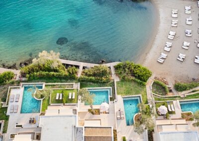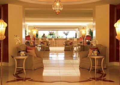 Hotelski sadržaj: hotel se sastoji od dve zgrade i bungalova u kojima su raspoređeni – recepcija, restoran, a la carte restoran, taverna na plaži, bar, snack bar, piano bar, TV sala, otvoren bazen sa morskom vodom, dečiji bazen, zatvoren bazen, jaccuzi, sauna, parno kupatilo, spa i wellness centar, igralište za decu, mini klub za decu, dva teniska terena, teretana, salon za masažu, pozorište, animacioni program, parking i dve privatne peščane plaže sa ležaljkama i suncobranima (besplatno).