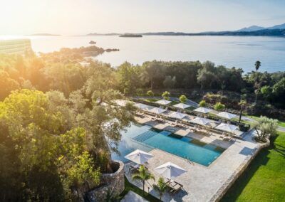 Lokacija: nalazi se na istočnoj obali, na poluostrvu u mestu Kontokali. Hotel poseduje dve privatne peščane plaže. Od grada Krfa je udaljen 6 km, a od aerodroma 7km. Autobuska stanica se nalazi na oko 500 metara od hotela, dok se prvi marketi nalaze na oko 900 metara od hotela.